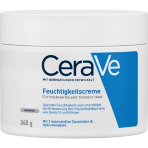 Die CeraVe Feuchtigkeitscreme 340g versorgt trockene bis sehr trockene Haut intensiv mit Feuchtigkeit und unterstützt die Erneuerung der Hautschutzbarriere. Dabei kann die Feuchtigkeitspflege für trockene Haut sowohl für das Gesicht als auch für den ganzen Körper verwendet werden. Die reichhaltige, nicht fettende Formel mit 3 essenziellen Ceramiden und Hyaluron wirkt den ganzen Tag lang – schon ab der ersten Anwendung.