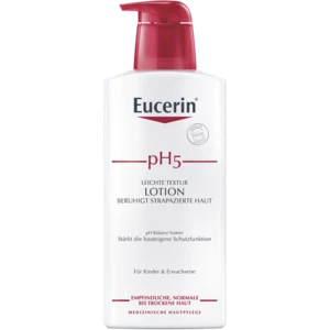 Eucerin pH5 Leichte Textur Lotion ist eine sanfte, aber wirksame Körperpflege, die speziell entwickelt wurde, um empfindliche, normale bis trockene Körperhaut widerstandsfähiger und weniger empfindlich zu machen. Das einzigartige Eucerin mit dem stellt den optimalen pH-Wert der Haut wieder her. Gleichzeitig hilft 5% , die Regeneration der Haut zu stimulieren und deren Widerstandskraft zu bewahren.